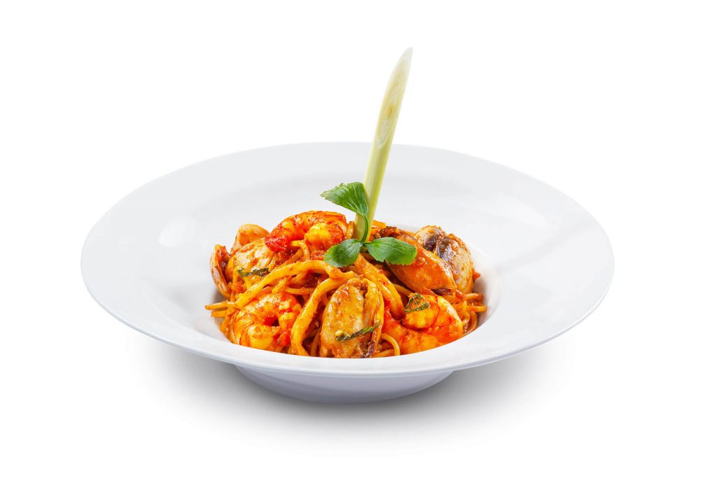 Sautéed Spaghetti with Shell Seafood in a Spicy & Rich Tomato Concasse